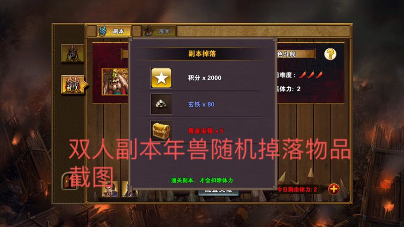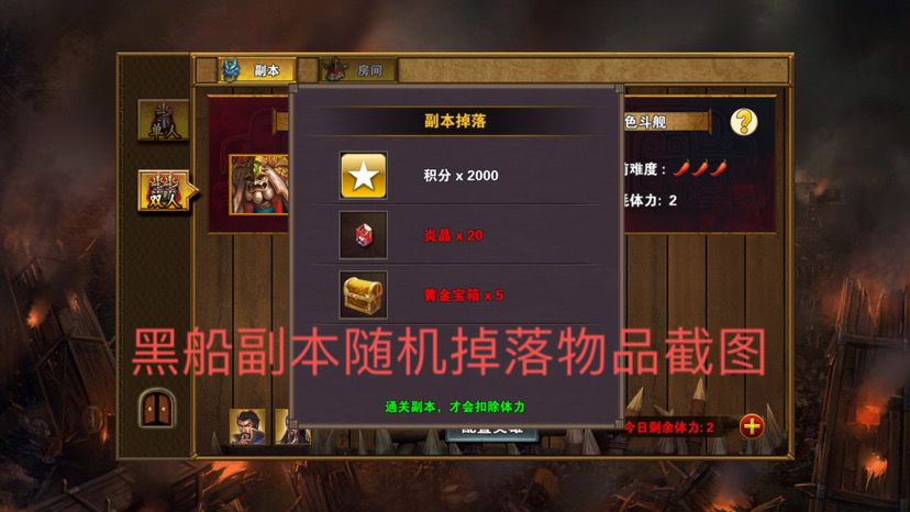 剧情图通关群雄伐董卓后变开放副本功能,老玩家都知道怎么玩,但是有些新玩家可能不知道怎么个打法,现在简要说明一下:副本分单人副本和双人副本,一般不建议打单人副本(收益太低),进入副本后需要配置两个英雄出战,新人随便配两个英雄上阵就可以,一般推荐曹操刘备。如果能联系到大佬带我们打副本,这样最好,直接开房等大佬进来就可以,全程躺赢看大佬打就可以了,最后领取奖励。如果没有大佬带打也不要急,直接开房便会有人进来,如果看到有人用吕布或者司马懿等能一回合清场,就说明遇到大佬了,等着过关领奖励即可,如果遇到上面出现(AL)字样或者队友也打不动,我们可以选择左上角⚙️图标选择投降,然后重新开房等待大佬进来。一般情况下黑船两分钟多点一局,每天每个账号免费6体力,可以购买18次体力,每次10金币1体力,打赢每次黑船还可以花金币重转一次(不建议购买体力和重转),除了黑色斗舰(俗称黑船)外还可以打年兽,年兽相比黑船来说相对麻烦一点,黑船、年兽副本掉落物品看附图。另外每周五、六、日会开放特殊节日副本,有三体力副本和六体力副本,随机掉落副本红装和副本英雄,具体打法这里不做细说。特别提醒:被大佬带黑船的时候最好出手速度不要太高,不然耽误时间!附视频、截图