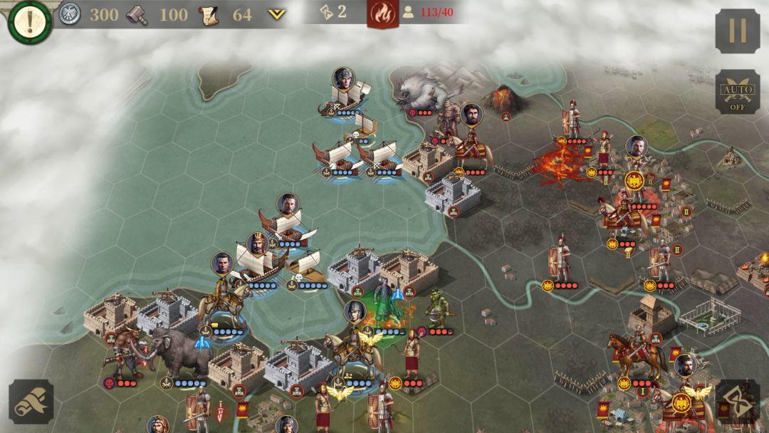 随后兵种放置位置如图5所示,给霍将军一个急行军,移动到图6位置干掉弓箭手,(庞培下面是哥布林),随后跳过该回合,可以发现敌方贝利撒留,比蒙兽和独眼巨人到上面去准备堵我们如图7,然后放他们鸽子,只留一个弓箭手在上面迷惑他们其他兵全部下来支援,当占领第一个关键地区时对面贝利撒留和独眼巨人会下来,占领第二个比蒙也会下来,时间紧迫,莽一点不要怕,让哥布林上岸并用一个急行军移动到祭坛处,放火并攻击如图8,这样祭坛掉血贼快,随后让霍将军和其他兵或神怪围住祭坛不让它刷兵,然后直接开干,注意相互支援。占领两个关键地区后留布雷比斯塔和秦俑轻骑兵,弓箭手守家,升级城池增加人口上线招兵买马,其他将领直接往右推过去,猛犸象和霍将军,阿米尼乌斯打汉尼拔和凯撒,庞培和指挥官从最右边向上(当汉尼拔被搞死后对面庞培会下来)接下来只要守住就可,到后面是可以招兵的不要怕