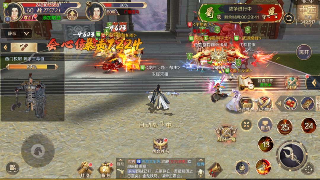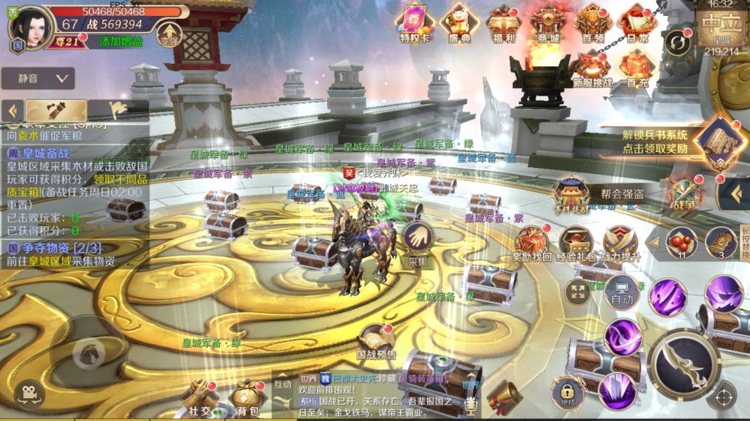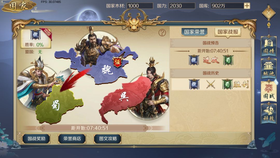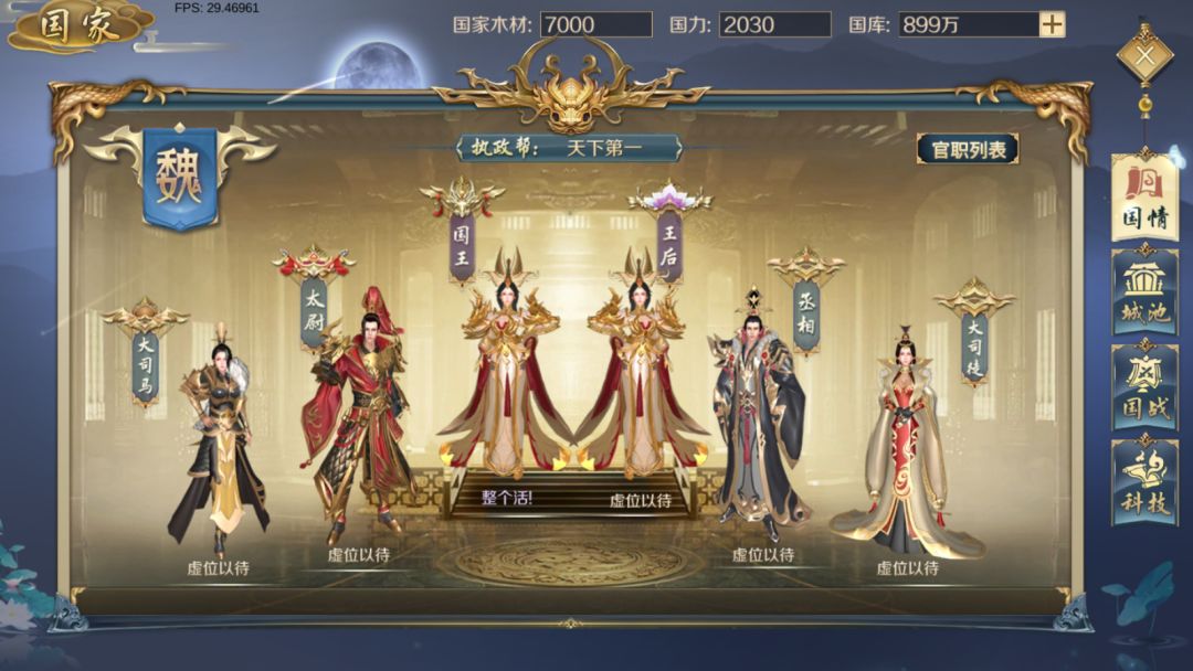 有国家,当然也会有国王,魏、蜀、吴三个国家,每个国王都是以帮派为核心,通过层层筛选,经过无数场战斗。最终获胜的帮派成为执政帮,而帮主则会自动成为该国家的国王,享受荣誉加身,获得极大权利。在荣誉之外,国王还要肩负起国家发展的重任。利用系统赋予的权利任命官员、研发科技,提升国家实力。一旦治理不力,导致城池被攻陷,该国家国民的收益都会受到影响。这可是其他MMO手游没有的体验。
