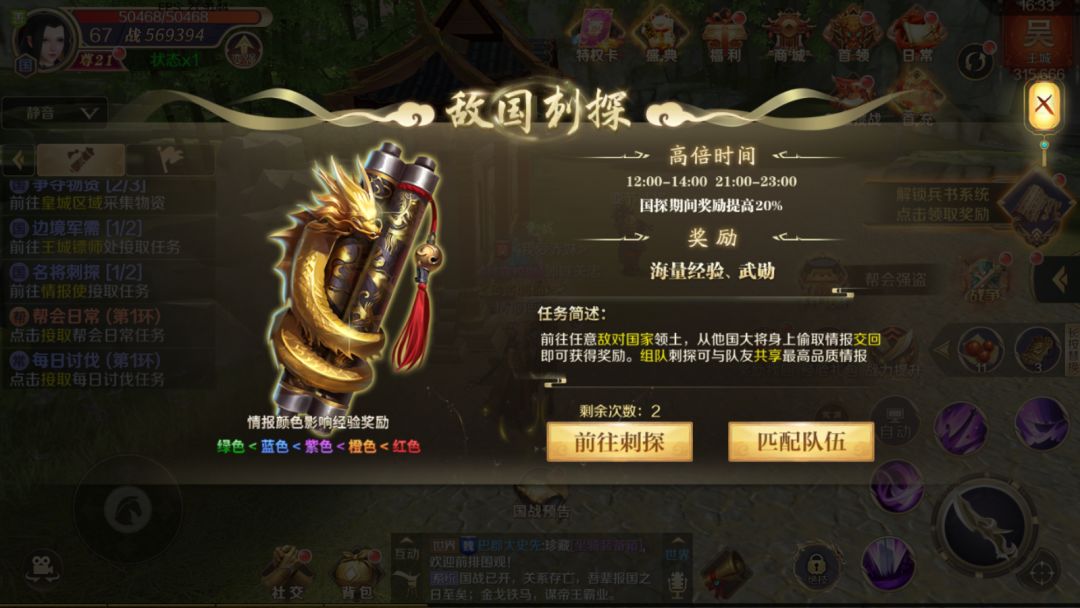 当然,国家的作用不仅仅只是社交系统,还是国家阵营势力对抗的基石。玩家可以通过刺探敌情,了解敌方具体实力,根据情报做出策略调整。以对自己阵营更加有利的布局,赢得战争的胜利。还可偷偷前往他国,趁对方没有发现,抢夺他国气运,削弱对方实力。