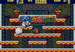 没错,《雪人兄弟》就是以《泡泡龙》为模板制作的动作游戏。一样是Q版可爱风格,一样支持双人游戏,一样是街机移植家用机,只不过1990年上市的《雪人兄弟》,要比《泡泡龙》晚了三年。
