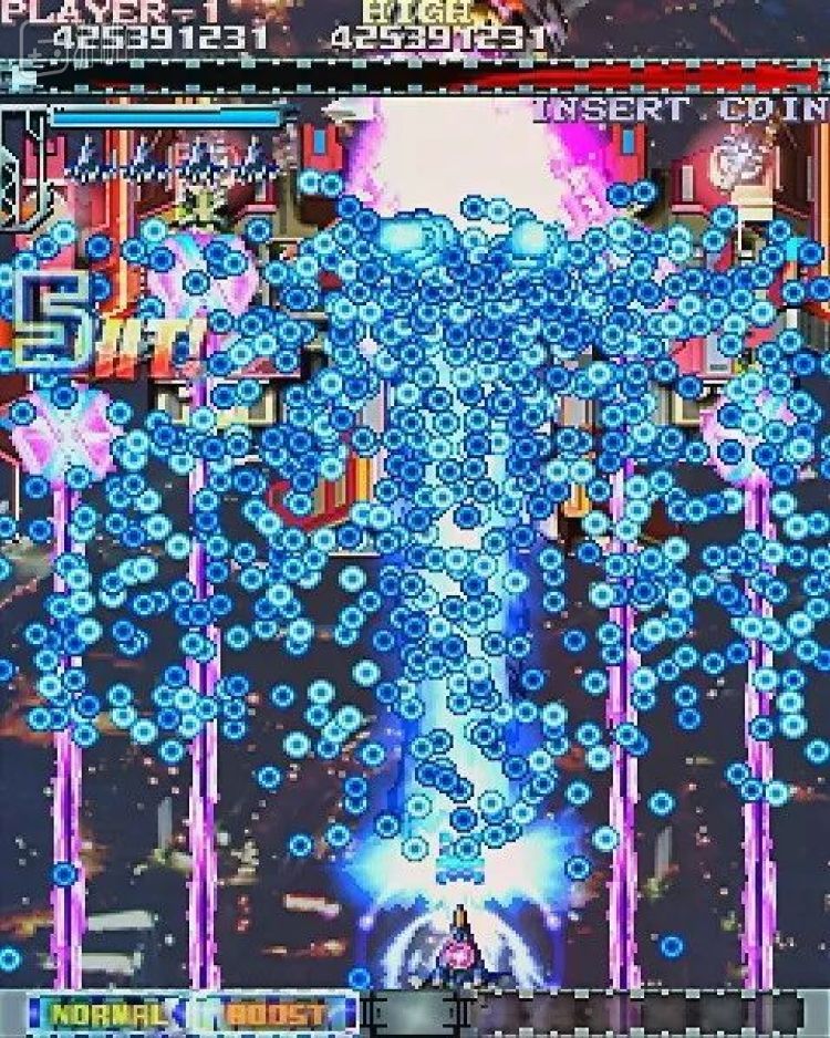 满屏密密麻麻的子弹,缓慢地互相交错,逐渐靠近玩家的飞机。寻找稍纵即逝的缝隙,躲开漫天的子弹,在看似不可能的夹缝中击杀巨大的敌人,这种全新的玩法成了STG爱好者的新追求。玩家们兴奋不已,激动地将这种全新形态的“打飞机”游戏叫做“弹幕游戏”。而Cave对这类游戏给出的定义则是——