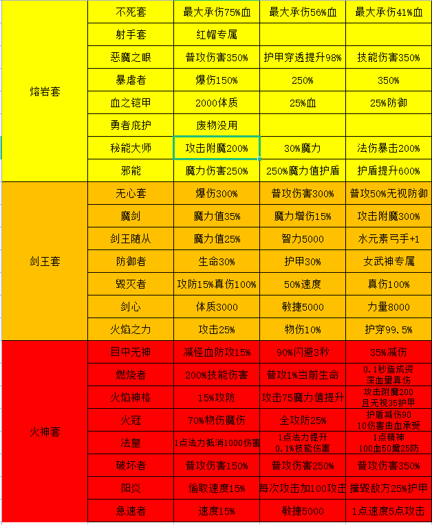 4.附送一张套装效果表格供大家参考,没收藏的可以收藏一下。顺带感谢一下某位不知名群友(表格是他做的不是我做的,侵权删)