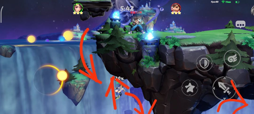 至于路线,最容易的(因人而异,熟练之后路线就都差不多)就是我现在图片红笔画的这个,上升标志代表着要小跳,记住,刚开始玩要贴墙,这样容错率更高不至于会掉下去;第二种路线就是我视频里第二次的,就是快到底部了小跳基本过尖尖再下b接上b