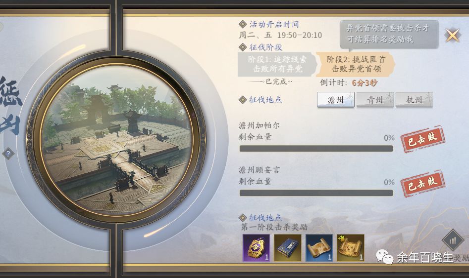 另,惩凶除恶也是一个有丰厚奖励的玩法,可以跟帮派小伙伴组成队伍一起去参加。惩凶除恶 每周二、周五晚上7点50分-8点10分。分为2个阶段,第一个阶段有5次奖励,击杀地图上的小怪即可获得奖励(根据任务提示找)。第二阶段队伍五个人可以分为2个人去青州加帕尔,2个人去青州顾妄言,1个到处跑。去杭州摸下三个boss。拿到5次奖励。前面2个人的拿排名前十的奖励,后面一个人摸的三次boss拿低保奖励。
