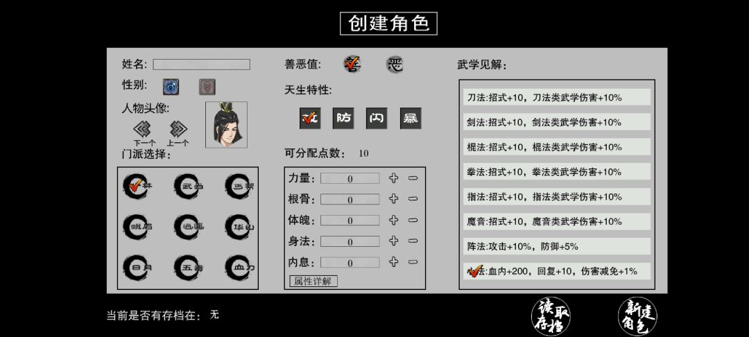 从开头玩家可以选择自己所在行的技能,比如刀法、拳法等等玩家可以依据自己喜欢进行选择,可以理解为也是这款游戏当中职业选择,通过开头给予的10点技能进行提升属性,每一个高于我们的人物相对应的属性也更在行,当然一般来说这俩系统的出现已经足够了,但是这款游戏当中确不同玩家还可以选择,游戏后面所进入的门派是那一个,或者自己天生的特点是在行攻击还是防御,对于我们在游戏当中都代表自己所玩法什么样,虽然看的没什么但是实际在游戏战斗当中有着非常实用的存在,可以说从游戏创建人物的第一步就让我体验满满的老游戏风格。