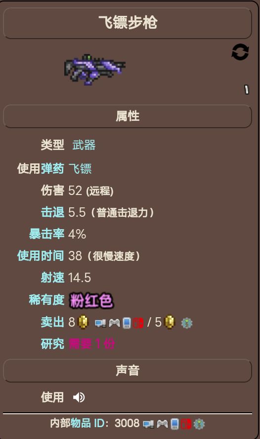 飞镖手枪与飞镖步枪并没有大的区别,较飞镖步枪而言攻速更快,攻击更低,击退更低,且没有自动挥舞,主要的区别在手感上,具体数值如下(截自wiki)