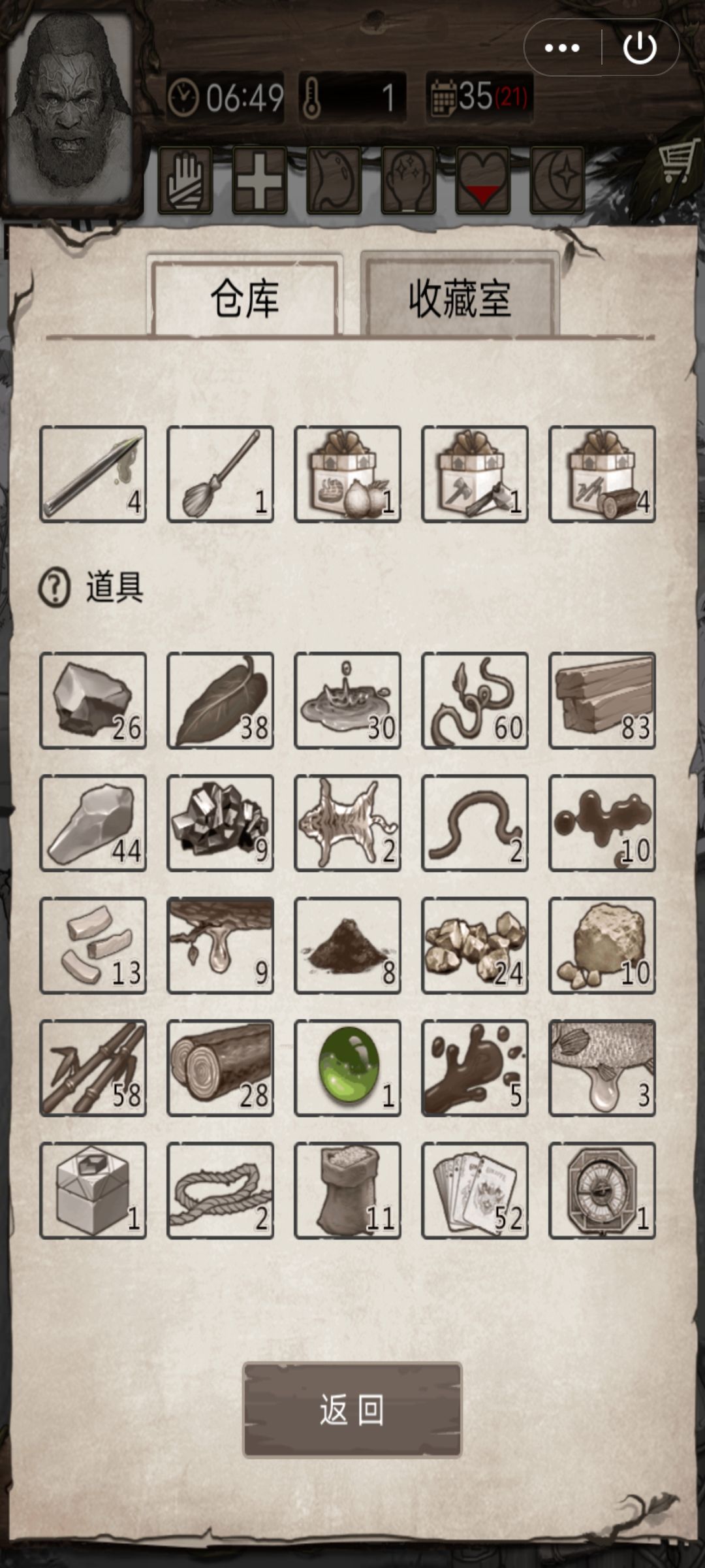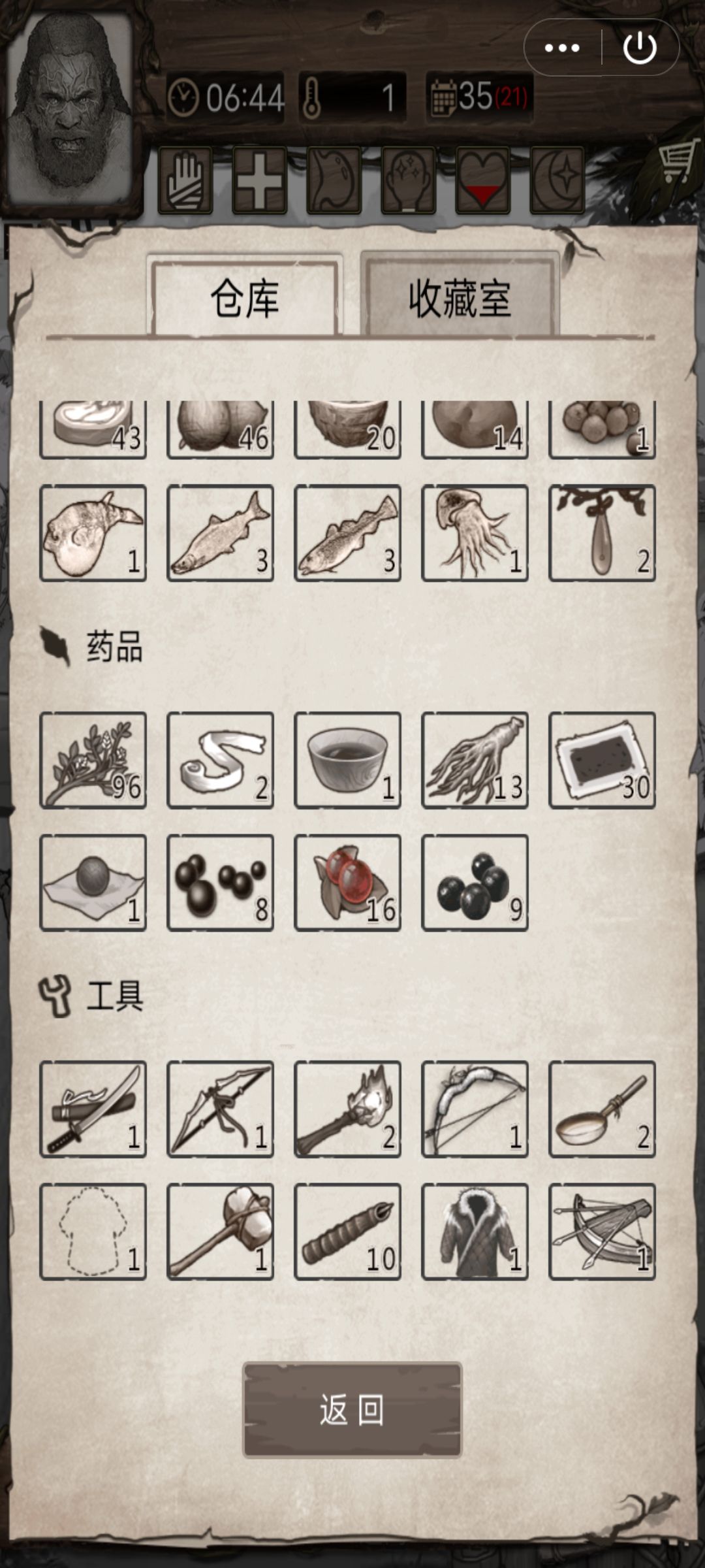 然后我开局出机器人那些什么的,收益有多大呢?看我35天的仓库吧。