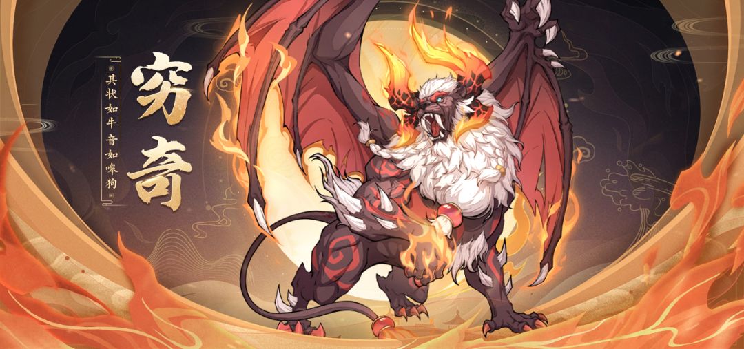 穷奇形如牛,头上的牛角仿佛是从岩浆中伸出,在头侧高高竖起,整个牛角散发出不详的红色气息,周围也散发着红色火光,只要穷奇愿意,随时都能用这对牛角给敌人带来致命一击。