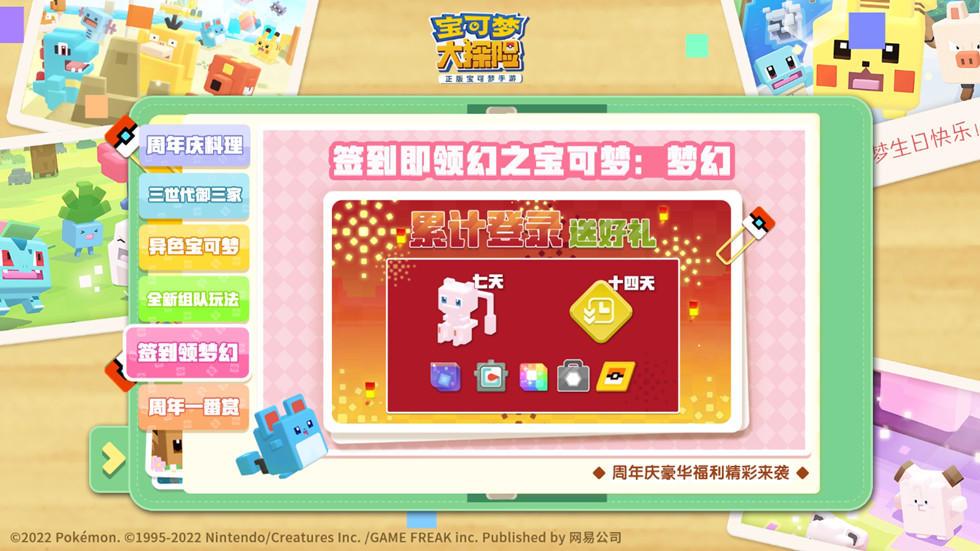 《宝可梦大探险》一周年庆典火热进行中,今日登录游戏,520福利雨上线即领!完成周年庆第七天签到,和幻之宝可梦 ▪ 梦幻做伙伴~烹饪方可乐逆袭能量饮料,开锅就有机会吸引新世代宝可梦~赶快锁定2022年网易520发布会,一键获取所有周年庆福利!