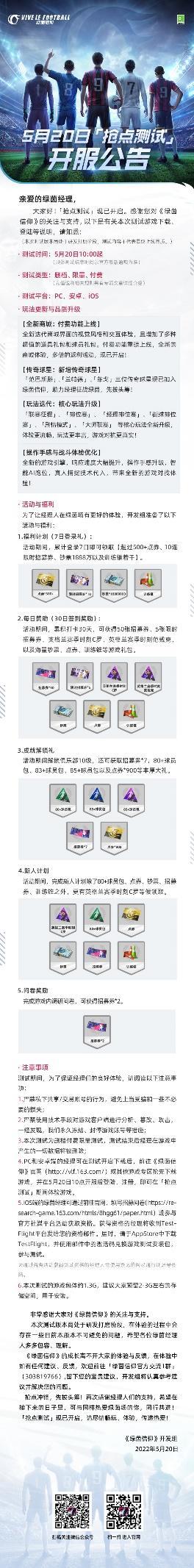 5月20日,是一个代表热爱的日子,《绿茵信仰》选择今天开启「抢点测试」,也是因为这款游戏倾注了来自开发组与所有参与共研的球迷玩家共同的热爱。为了感谢绿茵经理们的支持和热爱,「抢点测试」开放充值功能,测试期间经理们累计充值的总金额,将在游戏公测时按相应倍数返还点券!返还点券可在《绿茵信仰》不删档测试及正式运营后,购买商城及活动相关的所有商品(含付费商品),这样的福利力度千载难逢,各位玩家们可别错过了!