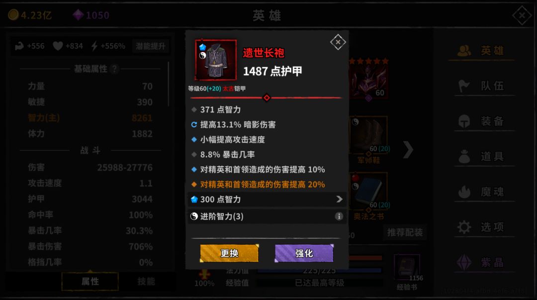 衣:智力 百分比体力 暴击 精英 暗伤 (遗世衣)