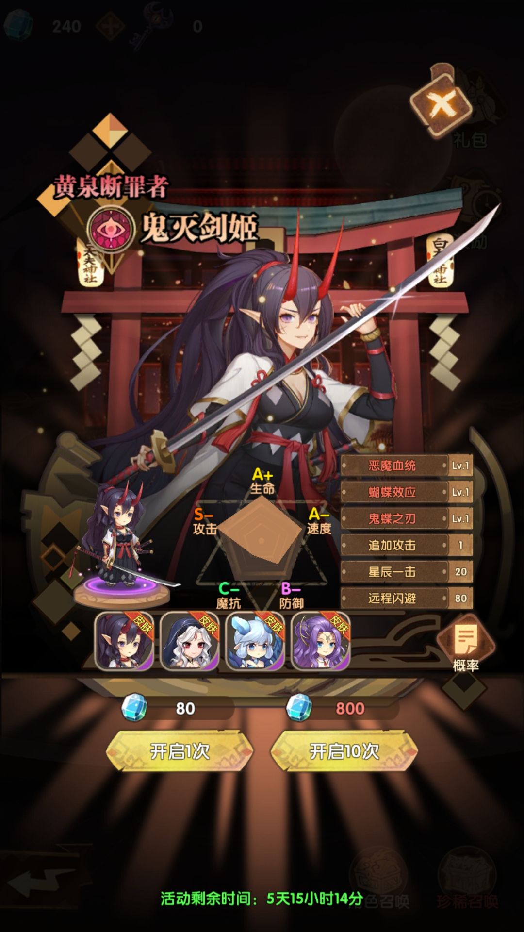2是 800钻那个珍惜召唤,之前有人说特别难抽,16000钻再抽,我还不太明白什么意思。 现在明白了,800一抽,第20抽给你个皮肤或者皮肤券。我已经18抽了,一直没抽到皮肤或者皮肤卷,还剩5天差1300钻,再抽两次拿保底的 鬼灭剑姬皮肤。