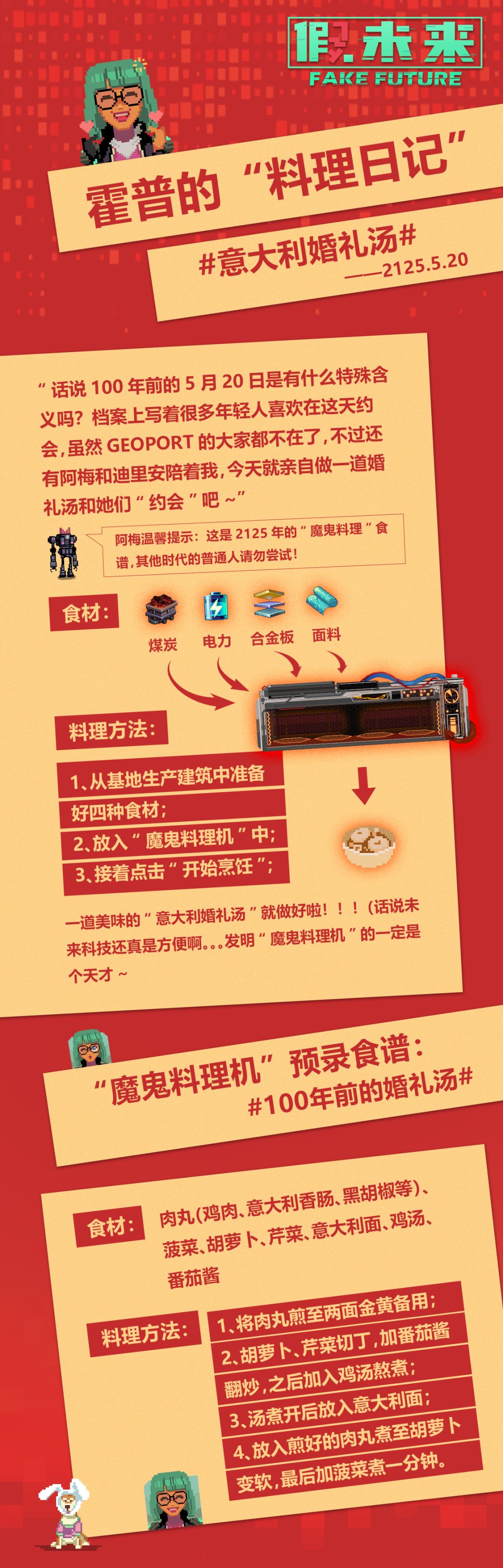 “话说100年前的5月20日是有什么特殊含义吗?档案上写着很多年轻人喜欢在这天约会,虽然Geoport的大家都不在了,不过还有阿梅和迪里安陪着我,今天就亲自做一道婚礼汤和她们“约会”吧~”