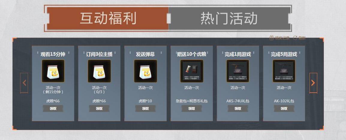 活动期间,广大先锋在活动页面达成指定条件,即可100%领取专享福利。其中,先锋通过订阅主播、发送弹幕、观看直播等方式可以获得大量“虎粮”;通过完成游戏对局、累计观看直播等方式,则能解锁丰厚的游戏道具礼包——“柯恩币礼包”、“ AKS-74U礼包”、“AK-102礼包”、“头盔礼包”和游戏道具任你领取。