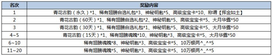 活动描述:活动结算时,充值前20名玩家可以获取丰厚奖励哦~