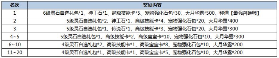 活动描述:活动结算时,召唤兽战力最高的20名玩家可以获取丰厚奖励哦~