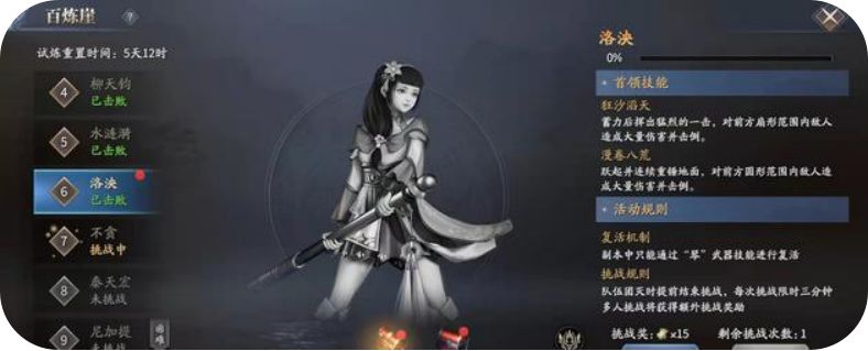 共计10位BOSS需要讨伐,击败后帮派全员获得首通奖励,单人或组队挑战,可领取“试炼奖励”。该玩法中,BOSS伤害高,血量厚,小编建议最好组队进入,中途如果死亡则需要【琴】武器才可复活,推荐组队邀请一位琴职业玩家。