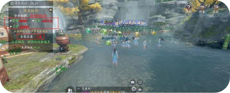 清泉沐浴活动还有“温泉秘药”玩法,玩家们可根据指示采集相应药材,制成秘药,比如图中的“柴胡桂枝汤”,饮用后有特殊效果。注意,采集清泉里的药材,要注意所要求剩余采集药材的数量,多了少了都会影响它的药效,收益下降。帮派内的小伙伴一定要多多合作,所以尽量提起安排一队人去采集一种,不采的人休息泡澡就好,都可以100,还有就是时间越快,越接近100排名越靠前。