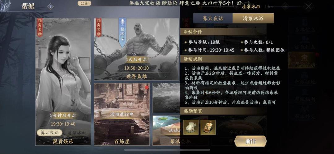 清泉沐浴:玩家们前往帮派驻地温泉池,换上浴衣,享受静谧时光。过程中,将不断获取阅历和丰富道具奖励,同时也可和帮派成员互动(相互搓澡等等)。