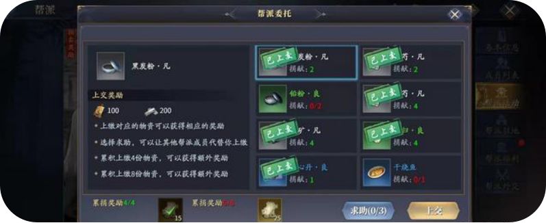 玩家每日可根据帮派需求,上交对应物资,获取奖励。一共8次,分别上交达到6、8次,还将获得累积奖励。如若本身没有对应物资,也可选择求助,请其他帮派成员代替上交。建议三次求助队友可以拿帮贡