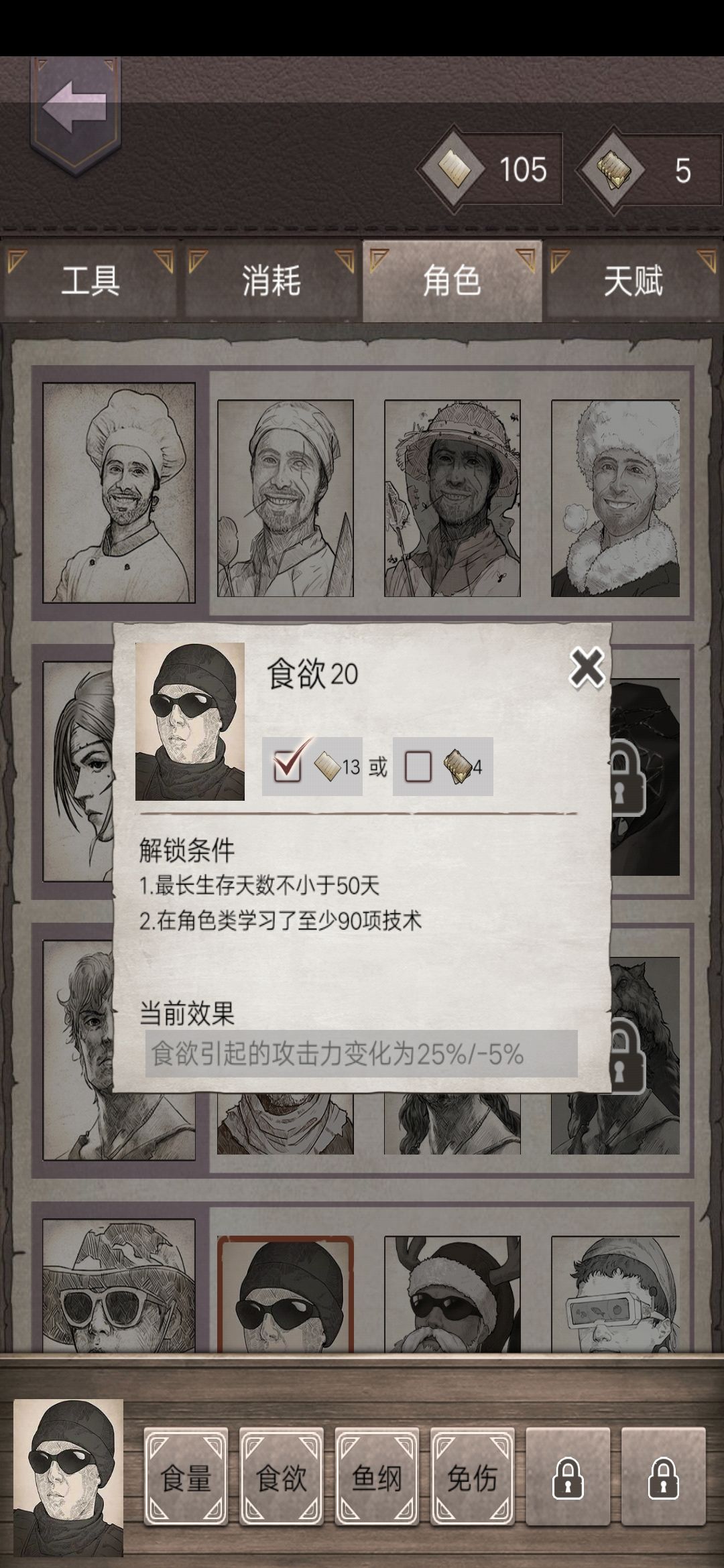 绝味小哥每天早上6点,在角色背包界面会刷新一个今天想吃的食物(大多数食物都可以通过制作和邮件获取),也就是今天的食欲,吃对应的食物满足食欲之后触发buff(最多持续22小时),buff提供30点固定攻击力,25%闪避概率,以及满足食欲时立即回复最多60点固定生命值。