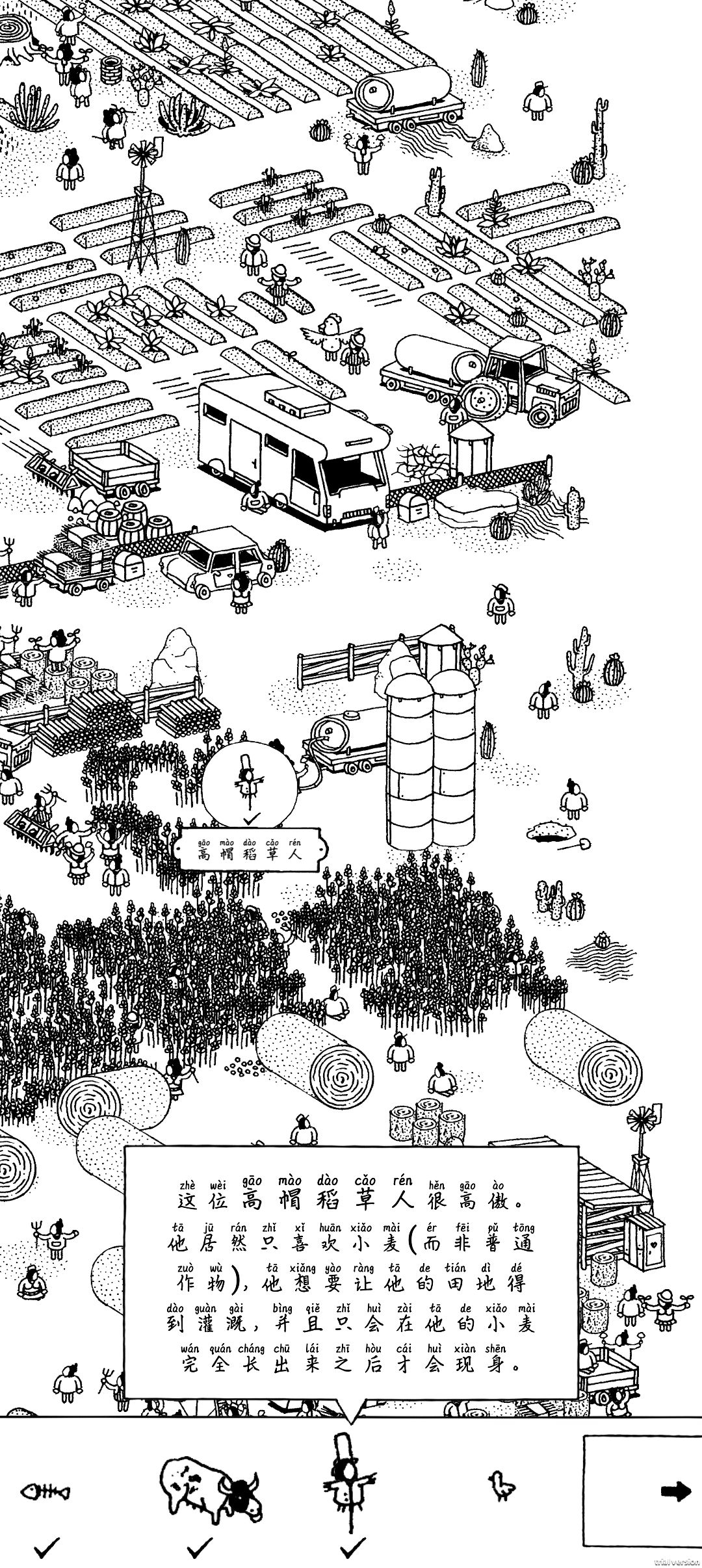 高帽稻草人在水车旁边的韬田里面