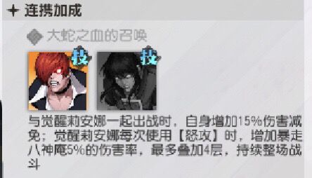 羁绊让暴走八神庵减伤15%,疯娜每次怒攻后还能获得增伤,最多叠加4层后就是20%,攻防兼备