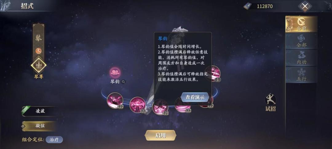 琴的被动叫作“琴韵”。随着时间的积累琴韵值可以不断累加,直到积攒满后便可施放任意技能触发,触发后周围内的友方和自身都会得到一次治疗。