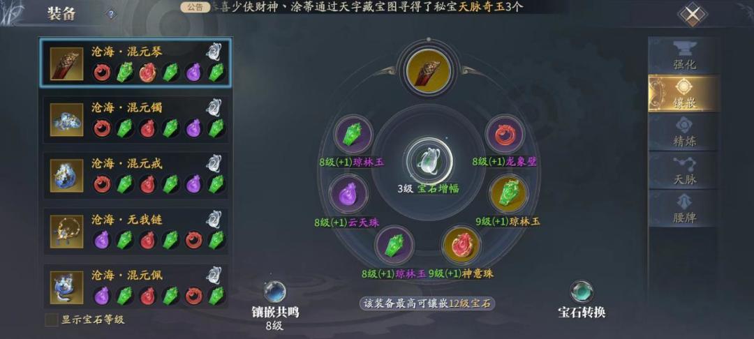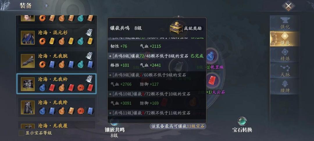 强化按照共鸣等级走就好,宝石优先攻击,木攻击,会心,身法,防御宝石自行根据实际情况搭配,宝石升级也是按照共鸣等级走。因本人追求攻击,所以宝石没加身法。