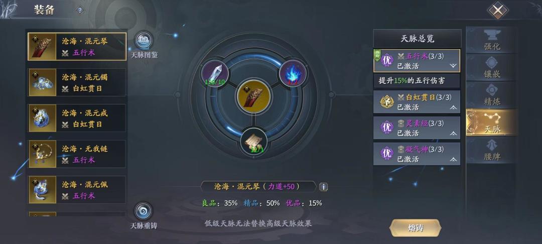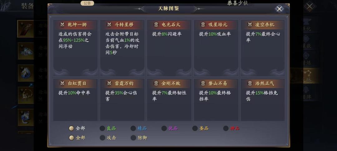 天脉系统,天脉分为攻击型和防御型,攻击类型的装备只能熔铸出攻击型天脉;同理,防御类型的装备只能熔铸出防御类型的天脉。只有三个同样得天脉才会激活天脉套装属性,所以按自己消费能力自由搭配。红色天脉比较难获得,所以可以搭配4套橙色天脉,建议是凌空杀机