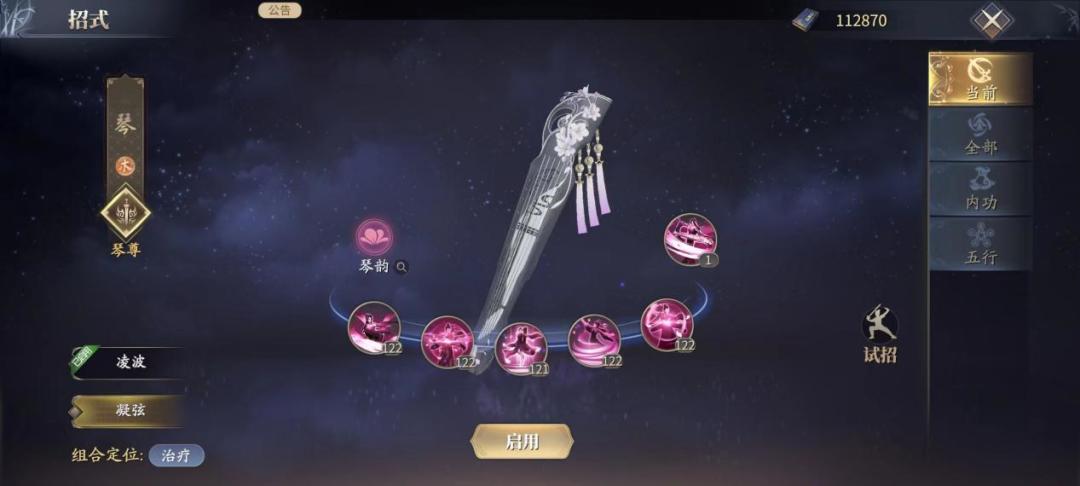 《破虏令》、《嫁衣神决》、《寒冰真气》、《龙象般若功》都是琴的专属内功,红橙等高等级内功较难获得,这里主要说一下紫色《龙象般若功》,它可以增加琴的招式伤害5%,提升所有技能的输出上限,搭配上《乾元罡气》《伐脉经》等蓝色内功,还可提升辅助能力,控制、回血能力提升,琴职业玩家本身的站场能力也有保障。如果想要选择输出的话,推荐《三阳真诀》,对定身/封招/眩晕敌人会额外造成伤害,适合琴这种控制频繁的武器。