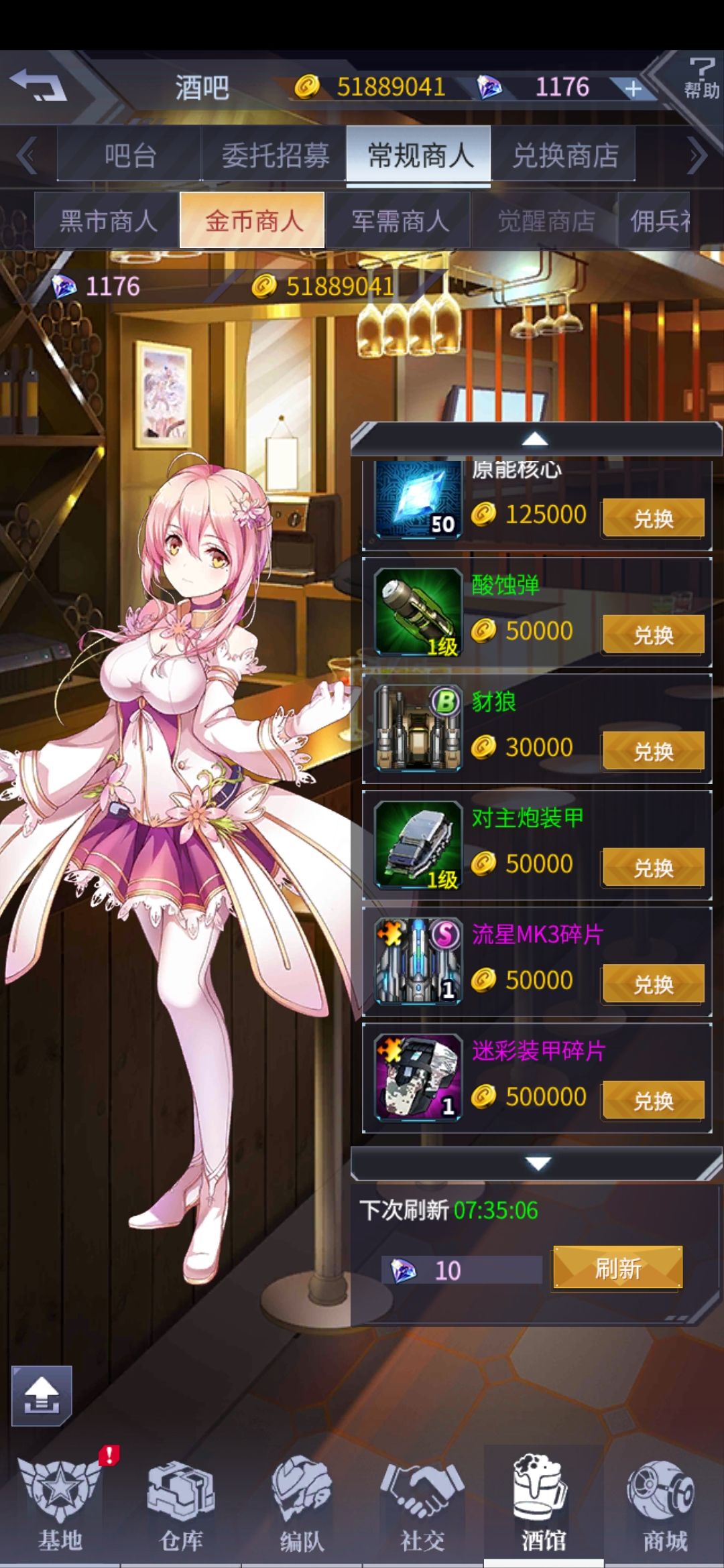 这里呢,就会用到金币商人了。时不时去看一下或者刷图的时候遇到金币商人进去看一下,如有稀有紫配碎和好感就可以进行购买,能刷的配件就不要金币购买了。我之前也写了攻略上有提过。金币商人里也就紫色配件碎和好感值得购买,像机体碎片和能源就很亏拉。