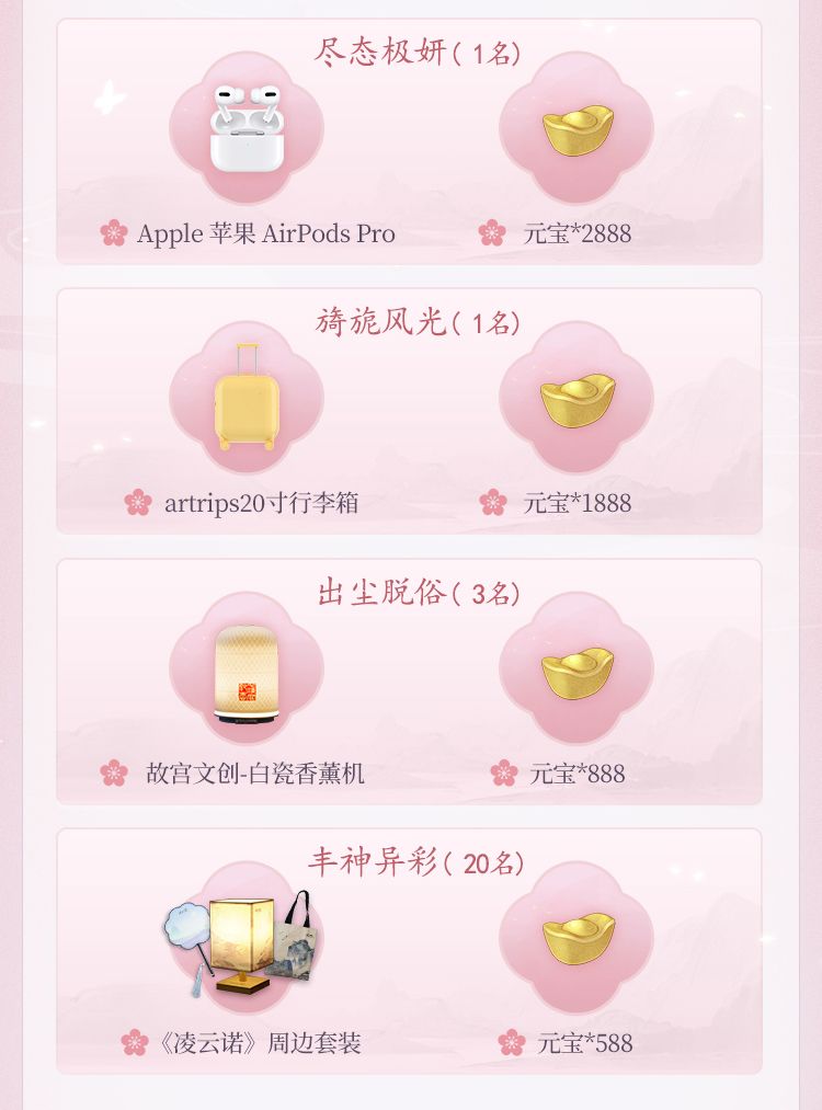 前往抖音,带话题#华裳伊人山河寻梦和#凌云诺并@凌云诺,发布古风仿妆视频(视频长度不小于15秒),同时将作品发送私信至凌云诺抖音官方后台,即有机会赢得AirPods Pro苹果耳机、artrips20寸行李箱及精美周边、游戏元宝等好礼。