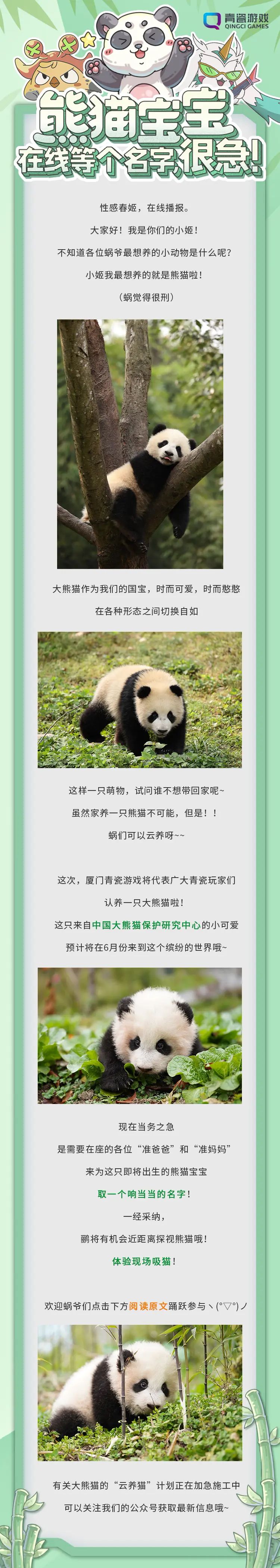 但是小姬老师好像还在头疼熊猫宝宝要叫什么名字呢?蜗爷们快一起来帮帮她吧!