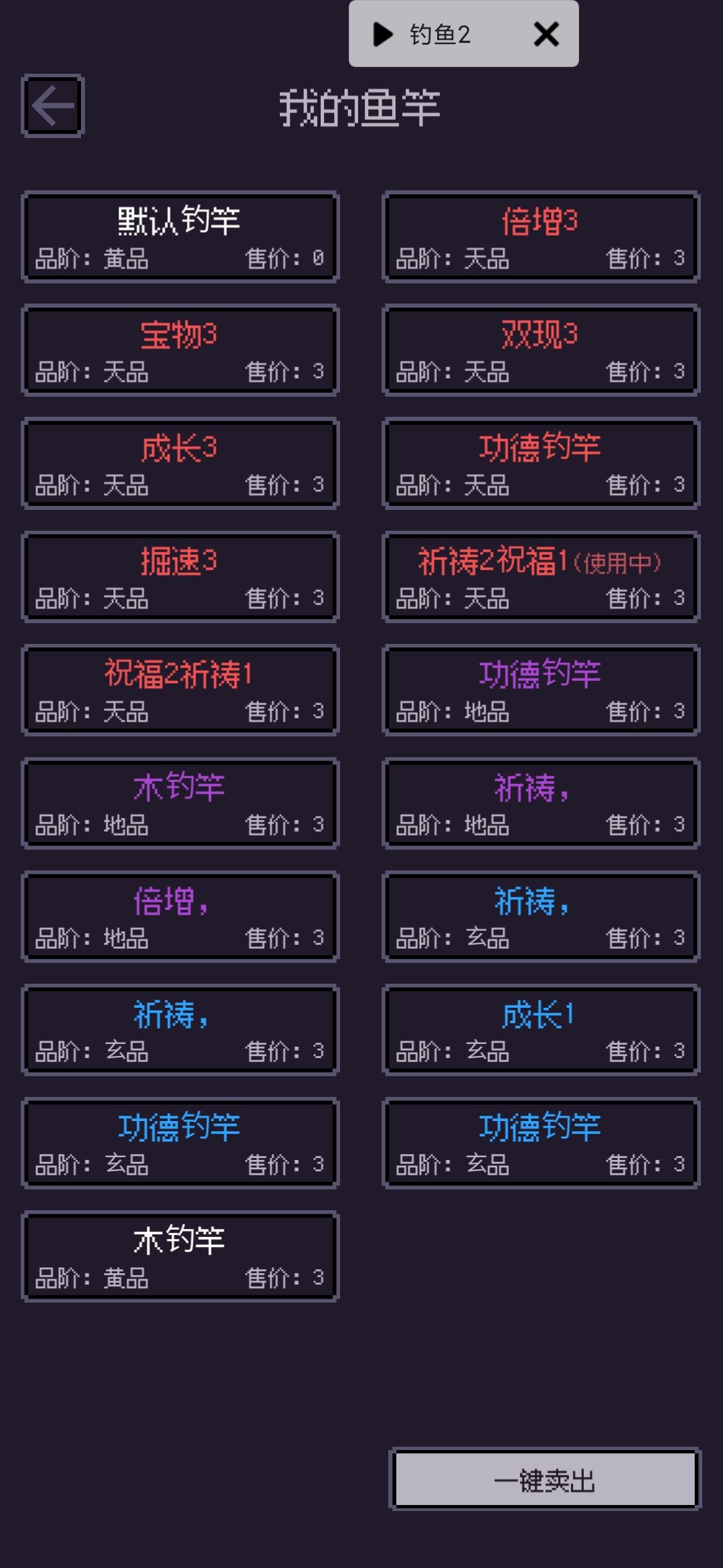 2500根黄品才出了这么几个,只要了祈祷,祝福,成长,宝物这几个词条。其中祝福没有效果,也可能是和广告祝福不叠加,目前广告祝福还有几个小时等到时间了再试试,祈祷感觉和钓物率有关(个人感觉是增加百分比的钓物率,有待验证),宝物还没试。强烈建议把装备词条写在装备名附近,同时增加全选键,一个个点过去太费时间了