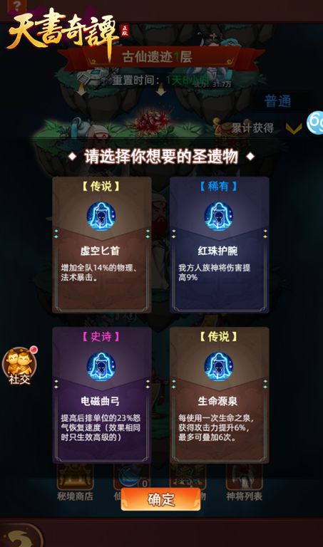 1、每日可挑战一次,每两层通关可获得一个宝箱,最终通关获得圣者遗物宝箱,奖励道具包含莲玉(游戏充值货币),五星超高潜力的神将碎片,各种数量巨大的珍稀道具等。