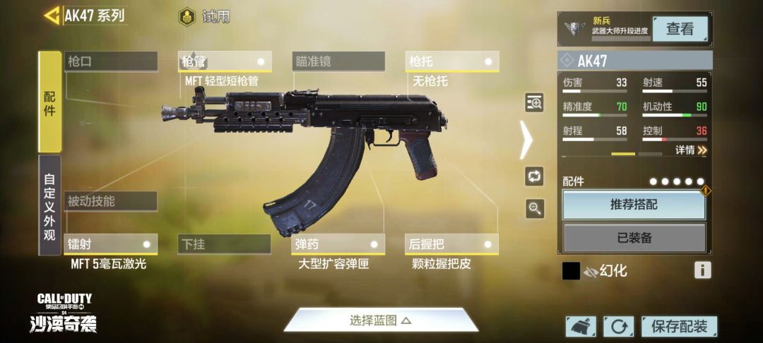 配件选择:MFT 轻型短枪管、无枪托、MFT 5毫瓦激光、大型扩容弹匣、颗粒握把皮。