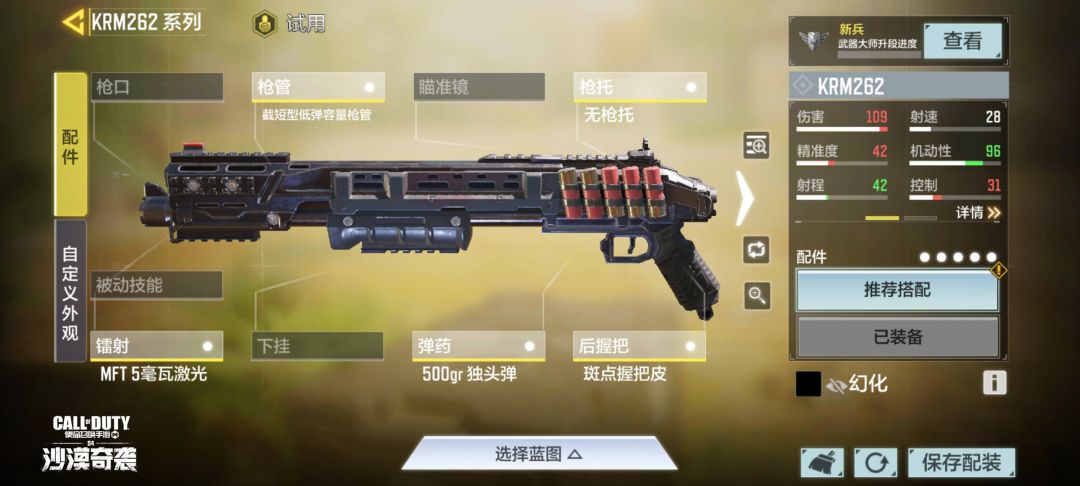 作为一把能够在中距离发挥作用的霰弹枪,KRM262是很多喜欢速攻战术的战士们最爱的武器。经过瘦普的搭配,它变成了Shorty的高配版。