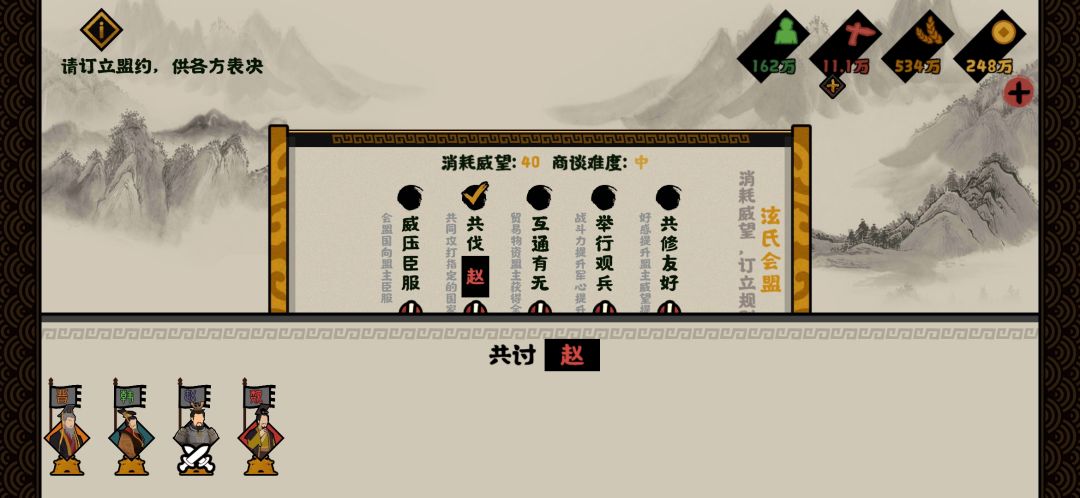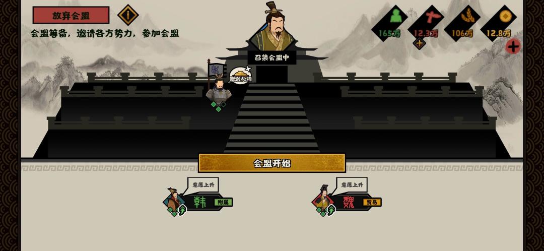 会盟时点击国家头像,可赠送礼金提升意愿值,增加同意概率