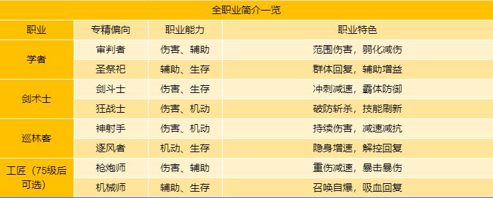 职业在75级时可开启专精方向,方向特色为大家做了总结,整体可分为输出和辅助,细节上也各有不同,大家可以根据自己的需求选择适合的职业。