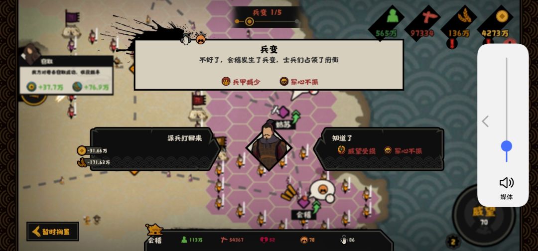 1.兵变的敌军数量和你的军团规模(也就的是最大出兵数)是一样的(也就是说你的军团规模越大,兵变的兵也越多)。军心也和你的一样。