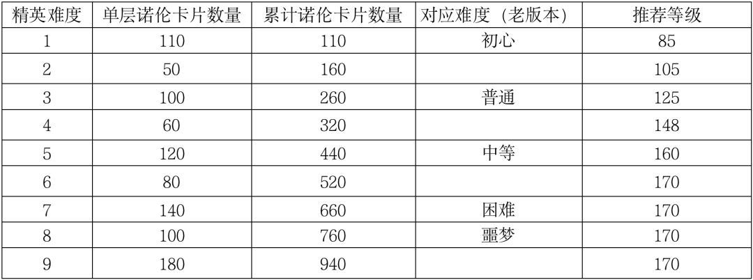 通关某层【精英】难度后会同时通关低于该难度的所有难度,并会获取对应的副本奖励(与原神谕副本的诺伦卡片获取规则一致),详情如下