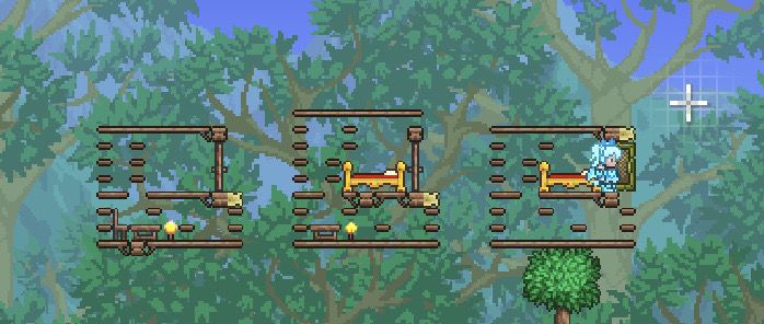 众所周知当床放置在有效房屋内时可以起到简单的设定复活点的作用,而倘若设定完复活点后想返回出生点则一般只能点击床尾复位,这就导致倘若想再回去有时会变得非常麻烦,需要赶很长的路,于是基于这种情况便研发了下图的装置, 装置原理是房屋有效性的判定,感兴趣可以自己查询wiki房屋页面。
