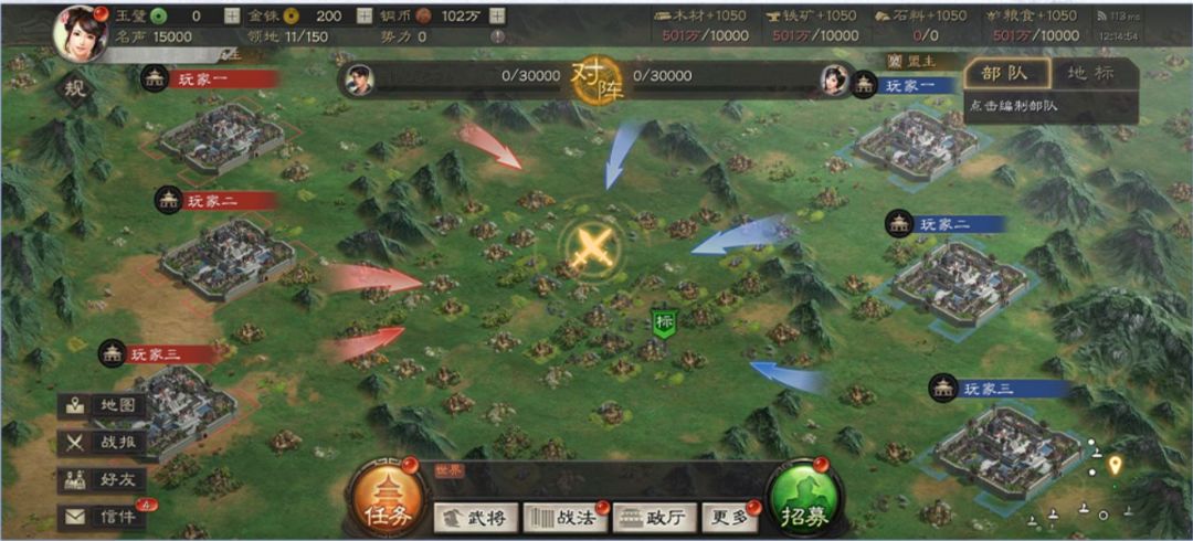 前15分钟:多对土地进行侦查,主要是规划欲争夺的地点,绕开有“贾诩”的7/8级地、甘宁程普、以及非常克制我方的队伍,尽可能地减少战损。