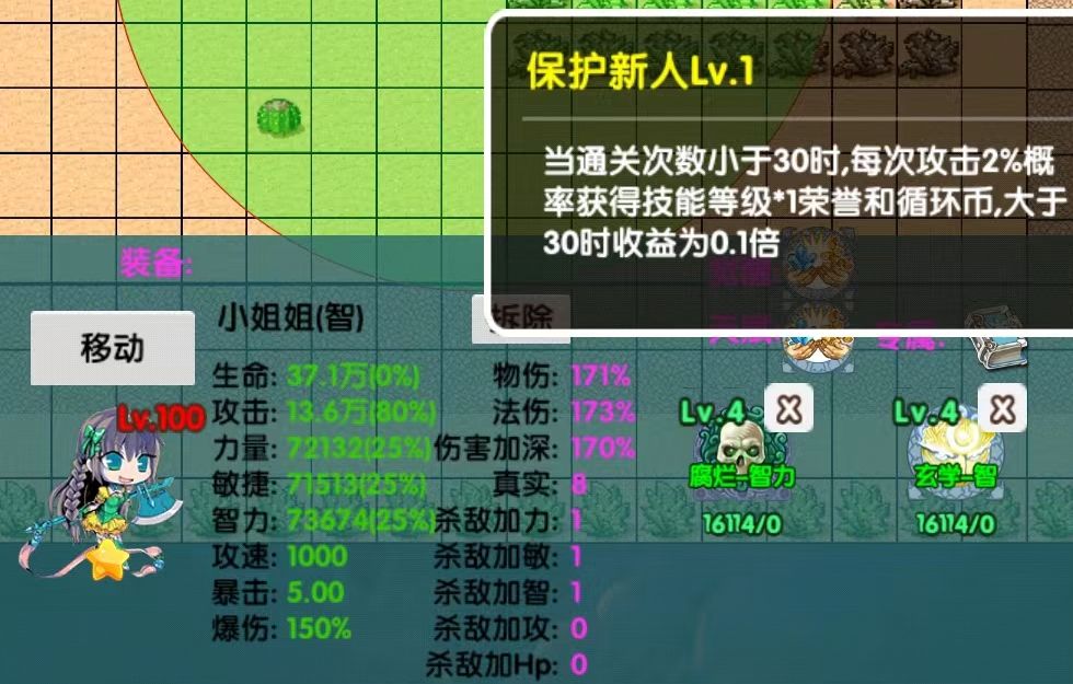 由于循环币和荣誉是后期买英雄和升级天赋用的,所以难度低的时候,一般先让“小姐姐”这个英雄上去刷币和荣誉,但是他只能带2个技能,所以初期小怪弱的时候,先带下面这2个,全是被动清小怪快的技能(后期换成其他的下面会说)