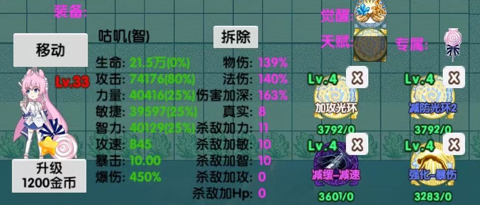 咕叽:目前主控辅助,初始天赋是加队友真实伤害,自己眩晕1.5秒,这个很恐怖了,后面基本上小怪都是秒清的,你能晕眩1.5秒,那清怪不是个事。由于把她当辅助了,所以给他的基本都是光环,还有减速,,这个减速是群减速,不是单体减速那个,满级减速25%,而后面还有一种减速光环,满级减速65%,这里面的减速效果是叠加的,所以,只要小怪不miss,基本上配合眩晕,就原地不动了。