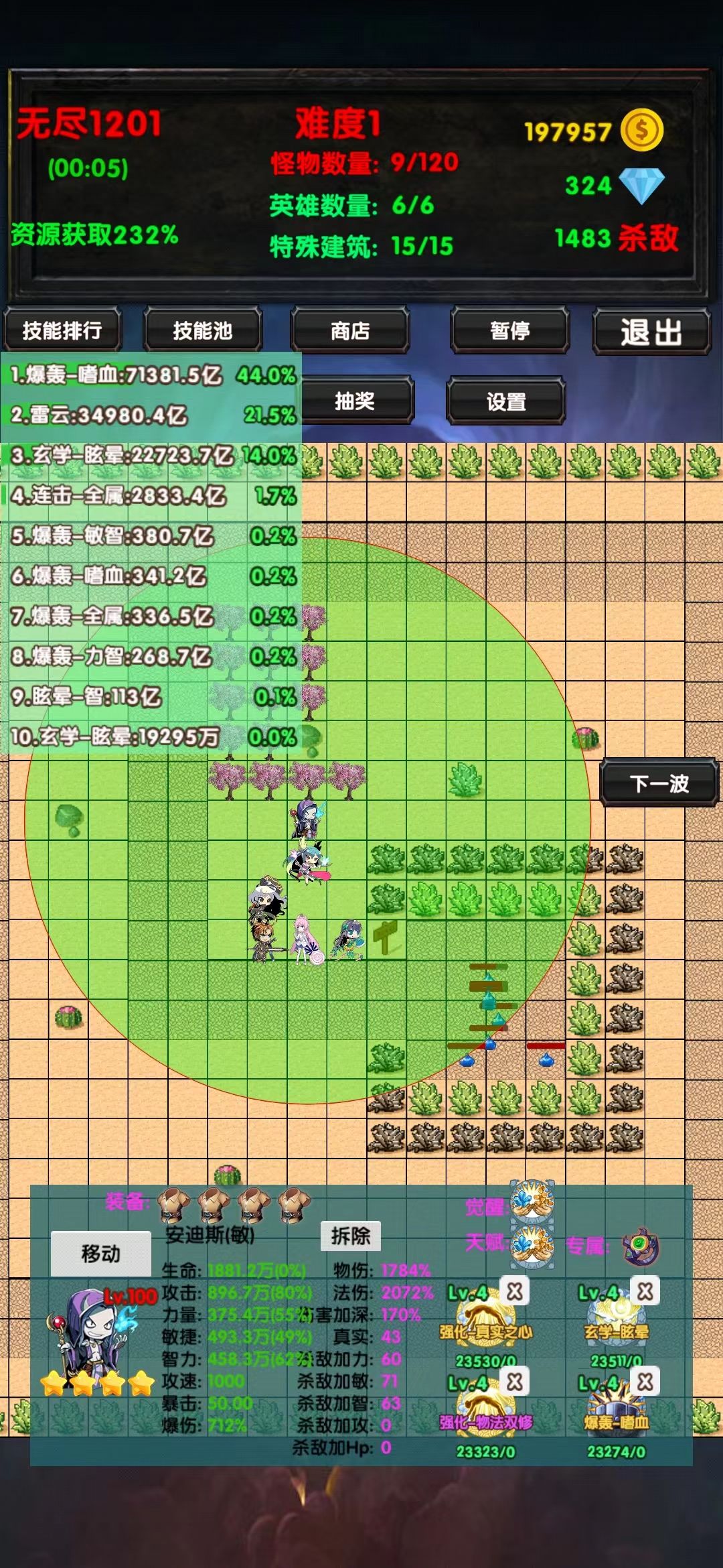 目前我是先上小姐姐,给他搜2个群伤技能,尽量找带被动群伤的技能,主动技能有CD,容易漏怪。然后造15个摇钱树,前期先疯狂涨钱。把小姐姐先升级满,稳住前期。低难度主要让小姐姐早点出去打币和荣誉,30波以后收获不大。30波之前把其他2个主C随便上一个,然后尽快用钻石就刷技能,主要是减速光环+减缓-减速+咕叽+眩晕,先确保小怪原地不动,然后自由发挥吧,可以优先刷群伤技能,也可以优先给安迪斯补齐其他技能。