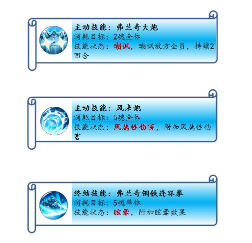 新世界弗兰奇的生存能力十分全面,4条生存被动使得他在防御时近乎没有短板。两条速度被动也是在无天赋加速的情况下,在第一回合中争取先手奥义的最强保证。