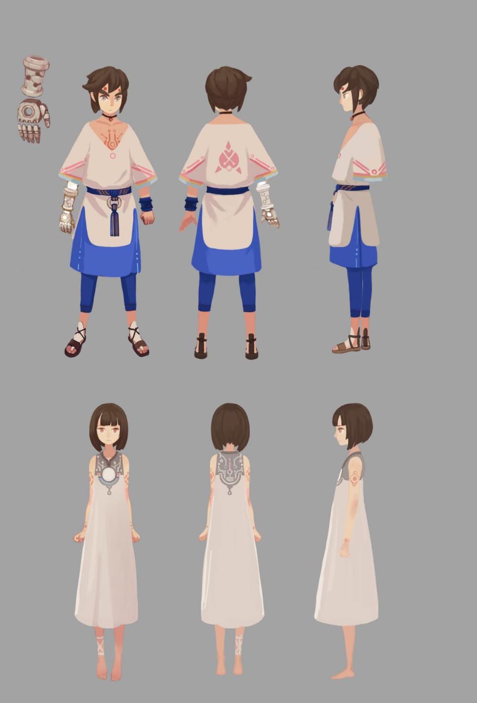 这套衣服中不难看出民族特色强烈的风格,美术组结合中国西南少数民族服装元素进行了设计,因此画面表现出罕有的异域风。迷宫是妹妹的梦境,也是二人记忆的投射。五彩斑斓的环境、神庙风格的场景、还有可怕的恶龙——无论怎么看,都更像一个童话中的世界。因此妹妹换上白色的长裙,以一个等待被拯救的少女的形象出现;同时,纯洁的白也有“尽头”和“虚无”的寓意,所以她以双足赤裸的形象出现在这样的世界中,正如一个新生的探索者。